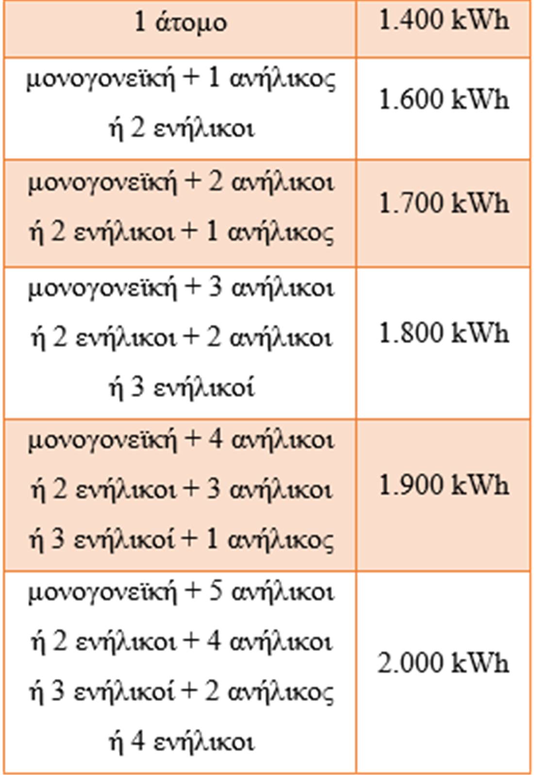 Για νοικοκυριό που στη σύνθεση του περιλαμβάνει άτομο με αναπηρία 67% και άνω τα παραπάνω όρια κατανάλωσης αυξάνονται κατά 300 kWh. Για νοικοκυριό που στη σύνθεση του περιλαμβάνει άτομο που έχει ανάγκη μηχανικής υποστήριξης με χρήση ιατρικών συσκευών, η οποία παρέχεται κατ' οίκον και είναι απαραίτητη για τη ζωή τους, τα παραπάνω όρια κατανάλωσης αυξάνονται κατά 600 kWh. Για κάθε επιπλέον ενήλικο μέλος προστίθεται κατανάλωση 200 kWh και για κάθε επιπλέον ανήλικο μέλος κατανάλωση 100 kWh, μέχρι του συνολικού ορίου των 2.400 kWh ανεξαρτήτως του αριθμού των μελών του νοικοκυριού. Το όριο αυτό αυξάνεται κατά 300 kWh για νοικοκυριό που στη σύνθεση του περιλαμβάνει άτομο με αναπηρία και κατά 600 kWh για νοικοκυριό που στη σύνθεση του περιλαμβάνει άτομο που χρήζει μηχανικής υποστήριξης.