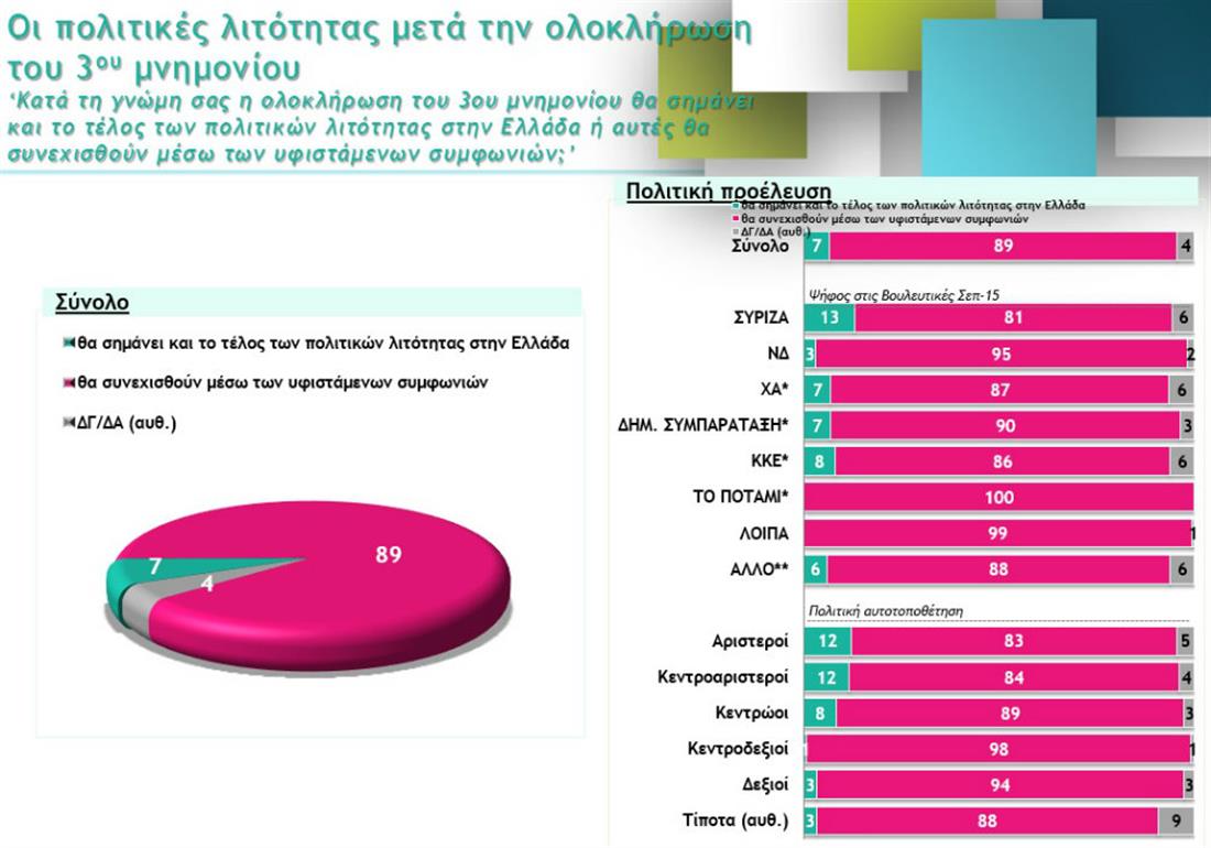 Ενδεικτικά, σχεδόν εννέα στους δέκα ερωτηθέντες (89%) εκτιμούν πως οι πολιτικές λιτότητας θα συνεχιστούν μέσω των υφιστάμενων συμφωνιών και μετά την ολοκλήρωση του τρίτου μνημονίου.