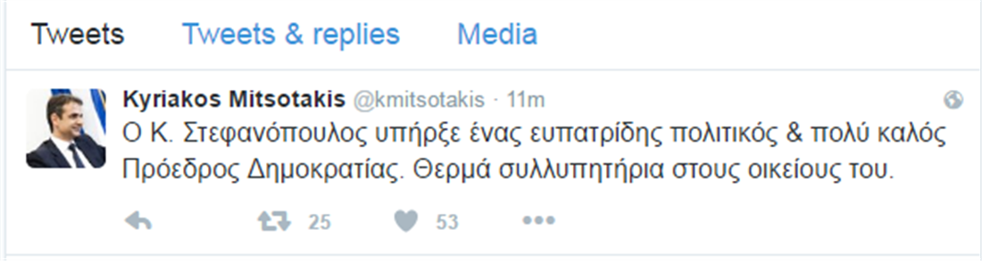 Σε μήνυμά του στο twitter ο κ. Μητσοτάκης αναφέρει: "Ο Κ. Στεφανόπουλος υπήρξε ένας ευπατρίδης πολιτικός και πολύ καλός Πρόεδρος Δημοκρατίας. Θερμά συλλυπητήρια στους οικείους του".