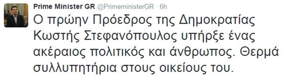 Ο Πρωθυπουργός σε ανάρτησή του στο Twitter αναφέρει: "Ο πρώην Πρόεδρος της Δημοκρατίας Κωστής Στεφανόπουλος υπήρξε ένας ακέραιος πολιτικός και άνθρωπος. Θερμά συλλυπητήρια στους οικείους του".