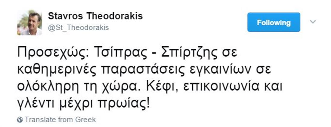 Σε ανάρτησή του στο twitter ο επικεφαλής του Ποταμιού Σταύρος Θεοδωράκης αναφέρει, με αφορμή την ομιλία του Πρωθυπουργού στα εγκαίνια: