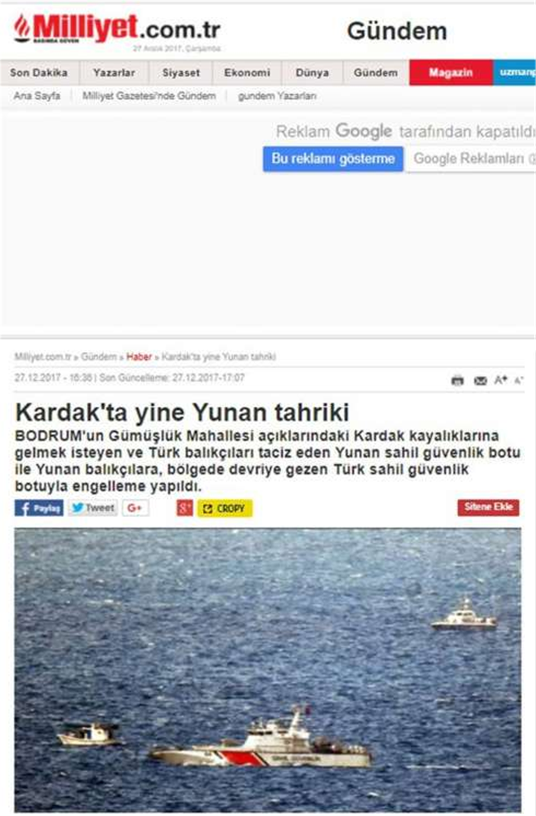 Σύμφωνα με το δημοσίευμα το πρωί της Τετάρτης τουρκική περίπολος εκδίωξε έξι ελληνικά καΐκια και μια ακταιωρό του Λιμενικού, που έφτασαν στα Ίμια από την Κάλυμνο .