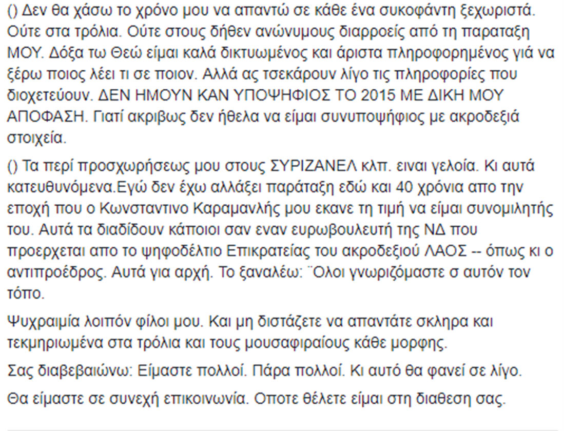 Ο κ. Αντώναρος σε νέα του ανάρτηση στον προσωπικό του λογαριασμό στο Facebook, χαρακτηρίζει γελεοιότητες τα περί προσχωρήσεως του στους ΣΥΡΙΖΑΝΕΛ κι αναφέρεται εκτενώς στο θέμα της διαγραφής του.