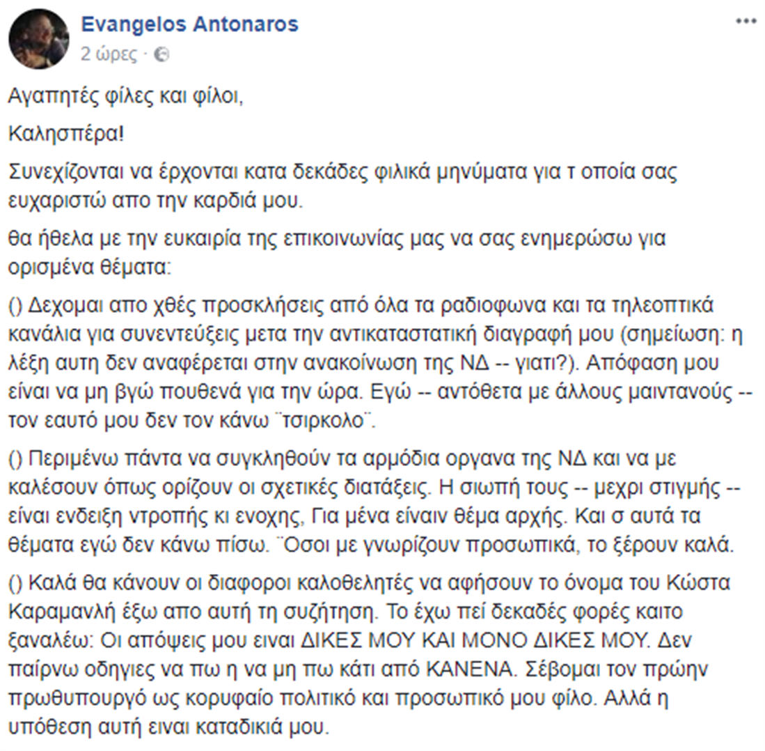 O αντιπρόεδρος της ΝΔ, στο πρώτο ουσιαστικό σχόλιό του μέσω Facebook, μετά τη διαγραφή Αντώναρου επισήμανε την ανάγκη ενότητας της παράταξης και σημειώνει ότι εάν ίσχυαν όσα του προσάπτονται θα είχε παραιτηθεί όχι μόνο από αντιπρόεδρος αλλά θα είχε εγκαταλείψει την πολιτική.