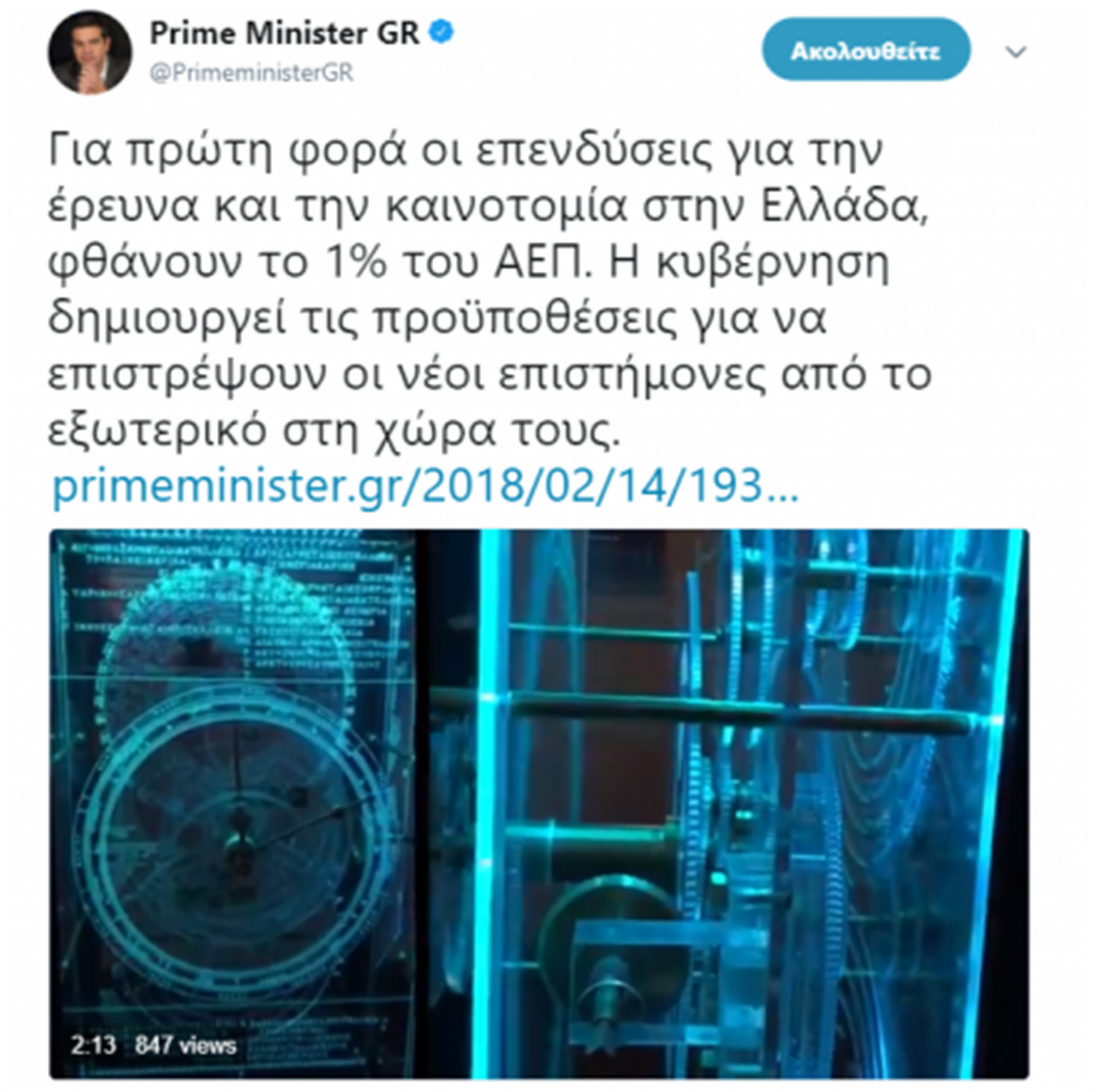 «Για πρώτη φορά οι επενδύσεις για την έρευνα και την καινοτομία στην Ελλάδα, φθάνουν το 1% του ΑΕΠ. Η κυβέρνηση δημιουργεί τις προϋποθέσεις για να επιστρέψουν οι νέοι επιστήμονες από το εξωτερικό στη χώρα τους», σημειώνει ο πρωθυπουργός Αλέξης Τσίπρας σε ανάρτησή του στο Twitter, η οποία συνοδεύεται και από σχετικό βίντεο.