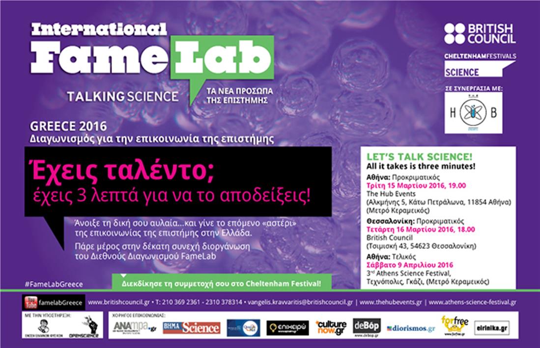 Το British Council, σε συνεργασία με το Hub Science, διοργανώνουν τον διεθνή διαγωνισμό FameLab, θέλοντας να αναδείξουν για δέκατη συνεχή χρονιά τα νέα ταλέντα στην επικοινωνία της επιστήμης.