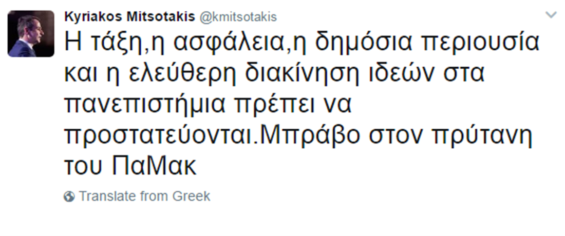 Τον πρύτανη του ΠΑΜΑΚ Αχιλλέα Ζαπράνη, συνεχάρη μέσω Twitter o Πρόεδρος της ΝΔ, Κυριάκος Μητσοτάκης, για την απόφασή του να καλέσει αστυνομικές δυνάμεις εντός του χώρου του ιδρύματος μετά από επεισόδια. «Η τάξη, η ασφάλεια,η δημόσια περιουσία και η ελεύθερη διακίνηση ιδεών στα πανεπιστήμια πρέπει να προστατεύονται. Μπράβο στον πρύτανη του ΠαΜακ», ήταν η ανάρτηση του κ. Μητσοτάκη.