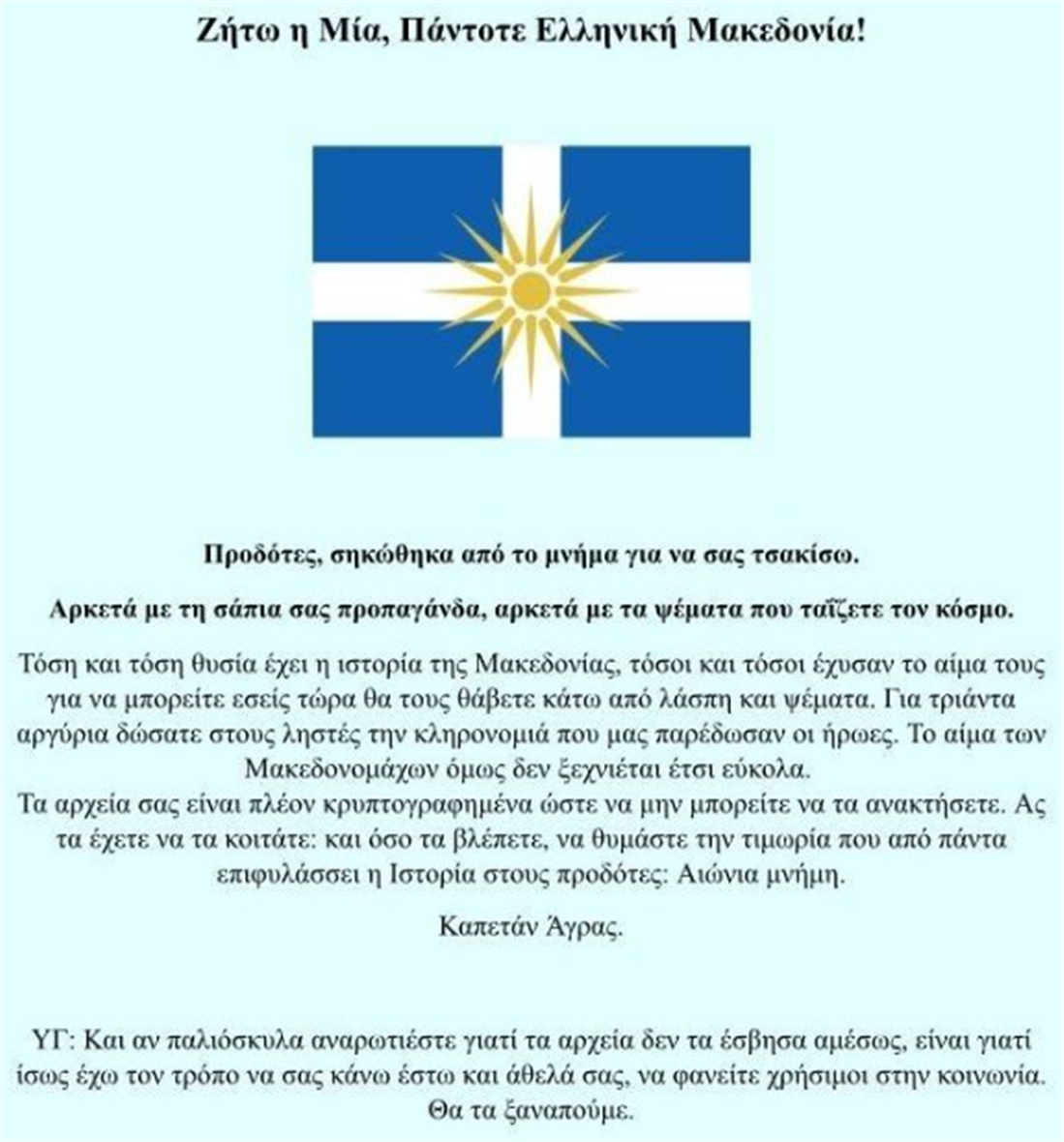 “Ανέβασαν” κείμενο με απειλές και χαρακτηρισμούς, με αφορμή τη Συμφωνία των Πρεσπών…