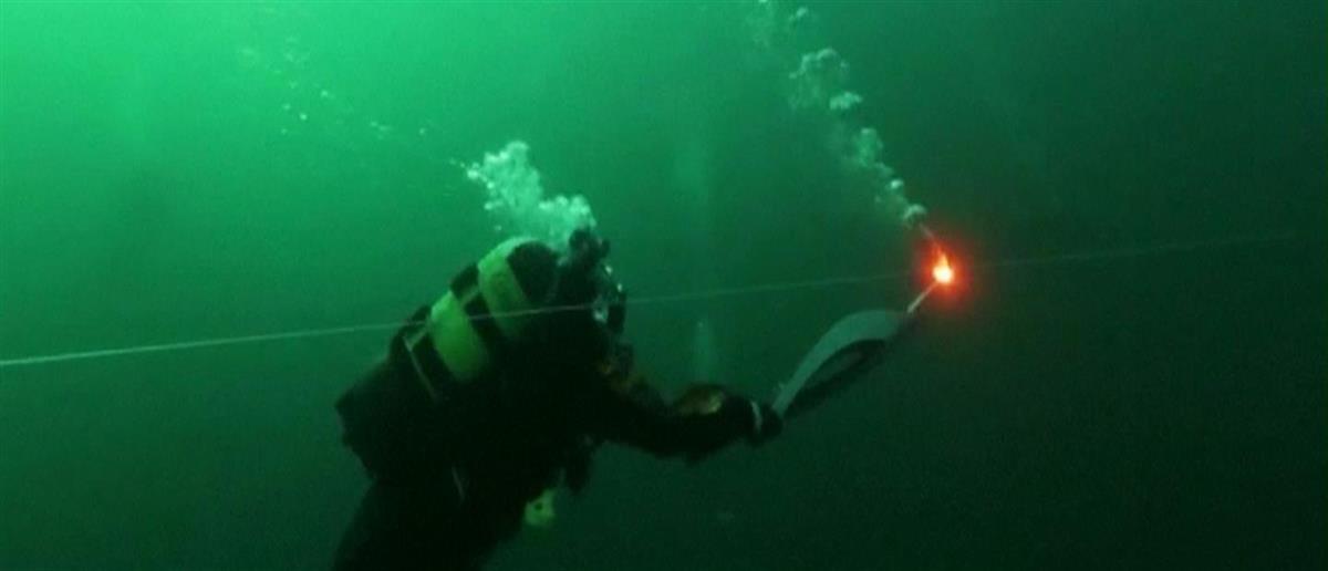 Χάρη σε μια ειδική αδιάβροχη κάψουλα, η Ολυμπιακή Φλόγα «φώτισε» τον βυθό της Βαϊκάλης.