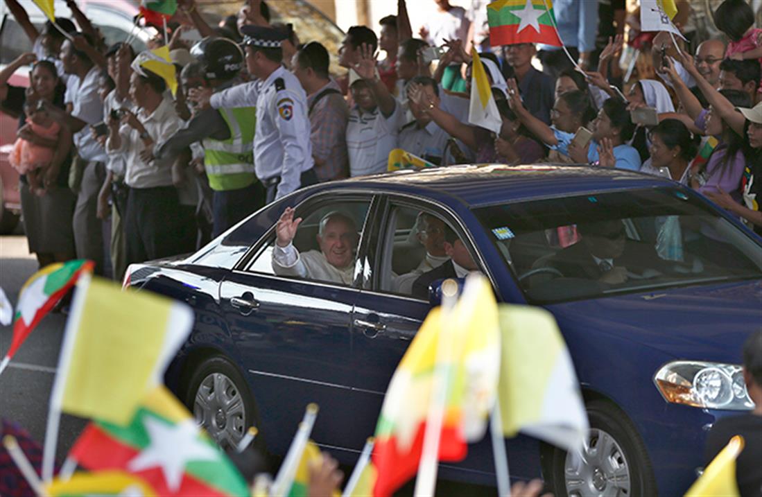 Χιλιάδες καθολικοί συγκεντρώθηκαν στη Ρανγκούν για να δουν έστω και από μακριά τον ποντίφικα. Το ταξίδι του Πάπα πραγματοποιείται εν μέσω κρίσης "Ροχίνγκια".