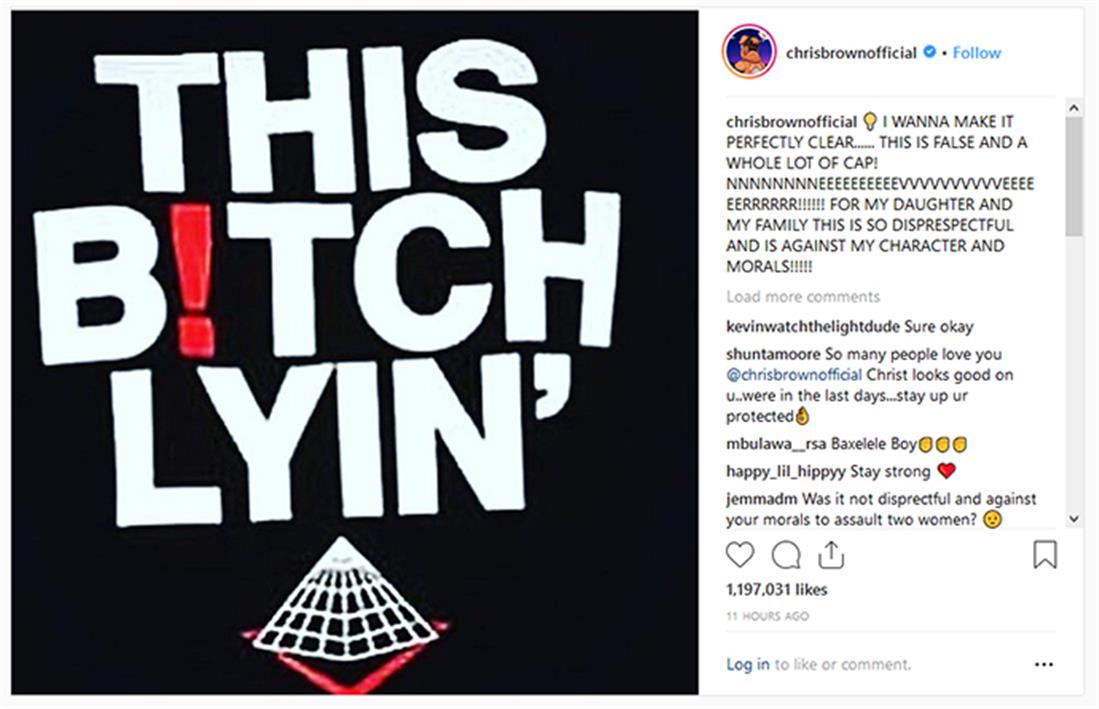 Λίγο μετά ο ράπερ – πρώην σύντροφος της Rihanna, που την είχε ξυλοκοπήσει άγρια – έγραψε στο λογαριασμό του στο Instagram ότι επρόκειτο για ψευδείς κατηγορίες, κατηγορώντας παράλληλα την κοπέλα που τον κατήγγειλε ότι «ψεύδεται».