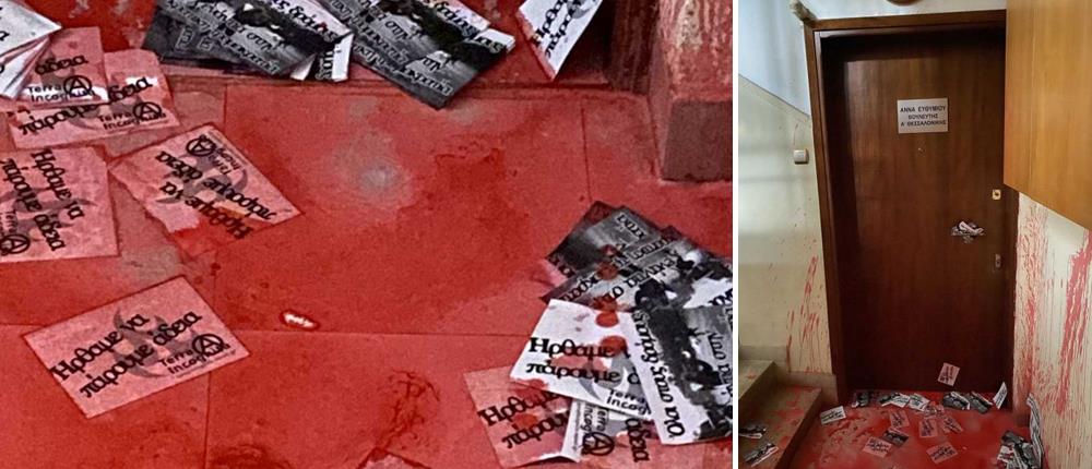 Άγνωστοι πέταξαν μπογιές και τρικάκια στην είσοδο του πολιτικού γραφείου της βουλευτού της Νέας Δημοκρατίας στην Α’ Περιφέρεια Θεσσαλονίκης, Άννας Ευθυμίου, στον 8ο όροφο πολυκατοικίας στην οδό Τσιμισκή.
