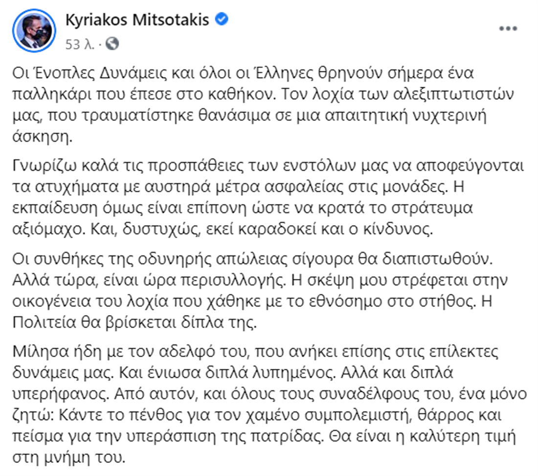 «Μίλησα ήδη με τον αδελφό του, που ανήκει επίσης στις επίλεκτες δυνάμεις μας. Και ένιωσα διπλά λυπημένος. Αλλά και διπλά υπερήφανος. Από αυτόν, και όλους τους συναδέλφους του, ένα μόνο ζητώ: Κάντε το πένθος για τον χαμένο συμπολεμιστή, θάρρος και πείσμα για την υπεράσπιση της πατρίδας. Θα είναι η καλύτερη τιμή στη μνήμη του», καταλήγει ο Πρωθυπουργός.