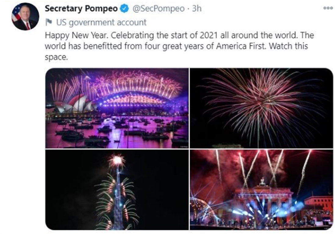 "Καλή Χρονιά. Γιορτάζοντας την αρχή του 2021 σε ολόκληρο τον κόσμο. Ο κόσμος έχει επωφεληθεί από τα τέσσερα υπέροχα χρόνια της Αμερικής Πρώτα. Δες αυτό διάστημα".