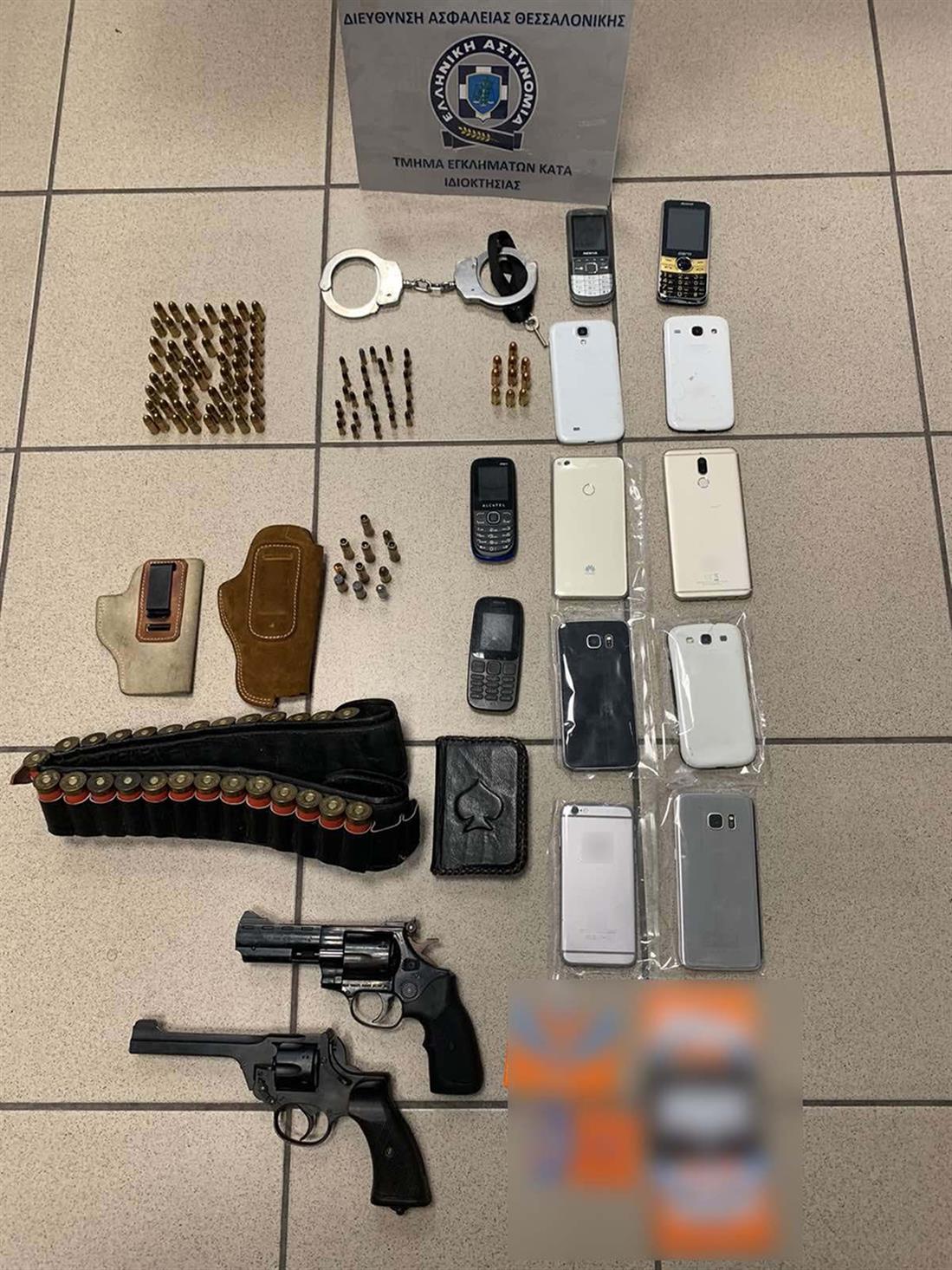 • Ο πρώτος κατείχε παράνομα πυροβόλο όπλο κρότου, πέντε (5) φυσίγγια, εμφανώς πλαστή κρατική πινακίδα, δύο (2) πινακίδες ΤΣΟΛ η γνησιότητα των οποίων ερευνάται, διαρρηκτικά εργαλεία, κλειδαριά τύπου χρηματοκιβωτίου και δεκαεπτά (17) κινητά τηλέφωνα, ενώ