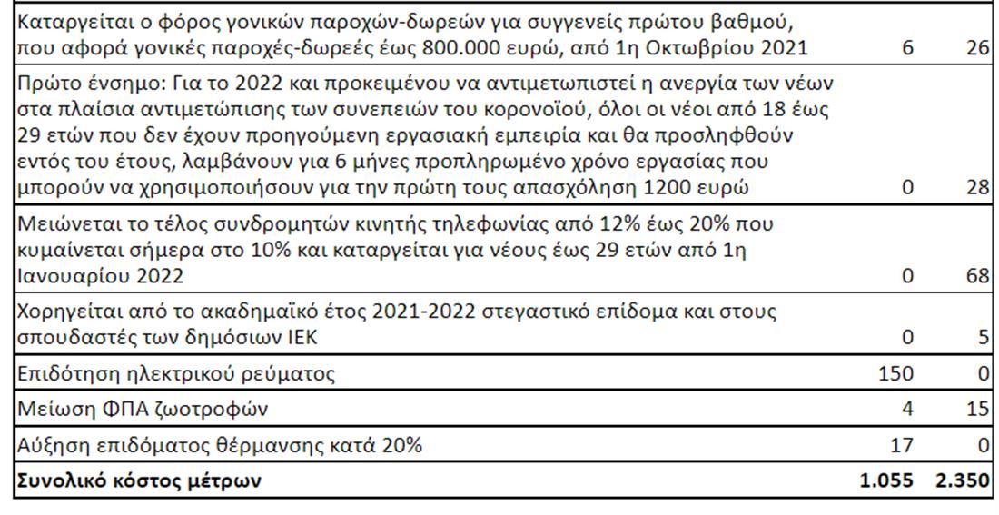1. Επεκτείνεται για όλο το 2022 η απαλλαγή από την ειδική εισφορά αλληλεγγύης και η μείωση των τριών μονάδων των ασφαλιστικών εισφορών στον ιδιωτικό τομέα. Κόστος 1,58 δις για το 2021 και 1,58 δις για το 2022.