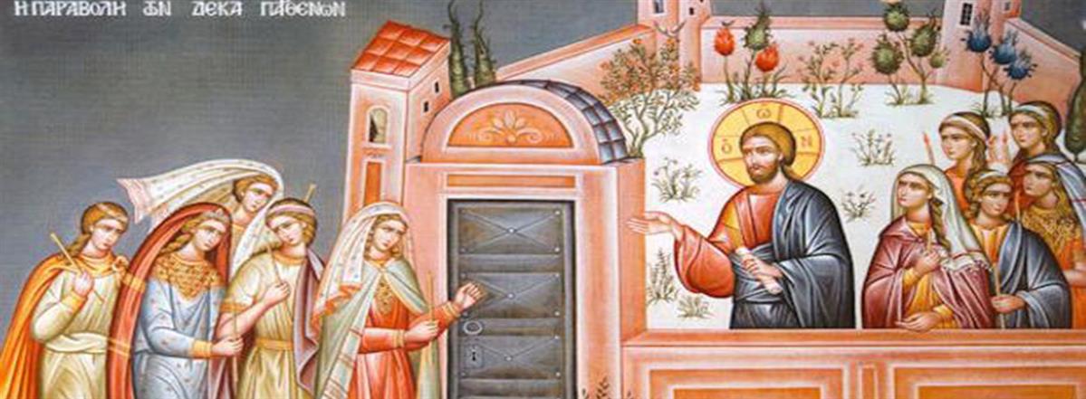 Η Βασιλεία των Ουρανών, μας λέει ο Ιησούς, μοιάζει με την παραβολή των 10 Παρθένων. Η ιστορία τους εν τάχει: Πέντε φρόνιμες και πέντε μωρές παρθένοι περιμένουν το Νυμφίο (γαμπρό) να έλθει να παραλάβει τη νύφη. Οι φρόνιμες παίρνουν μαζί με τα αναμμένα λυχνάρια τους και λάδι, όχι όμως και οι μωρές. Ο νυμφίος, όμως, αργεί, οι παρθένες νυστάζουν και κοιμούνται. Όταν ακούγεται η φωνή «Ιδού ο Νυμφίος έρχεται», οι μωρές παρθένες ψάχνουν να βρουν λάδι για να ανάψουν τα σβησμένα λυχνάρια τους, αργοπορούν και μένουν έξω από το γάμο, δηλαδή «εκτός νυμφώνος».