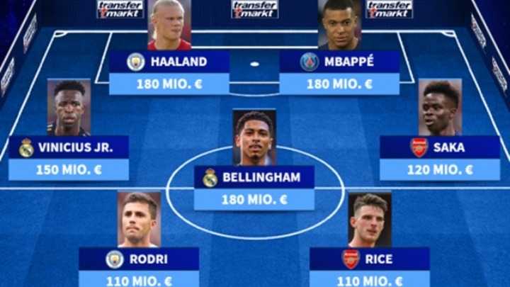 Η κορυφή της κατάταξης είναι μία...πολυθρόνα για τρεις, αφού εκεί..κάθονται οι Έρλινγκ Χάαλαντ (Μάντσεστερ Σίτι), Κιλιάν Μπαπέ (Παρί Σεν Ζερμέν) και Τζουντ Μπέλιγχαμ (Μάντσεστερ Σίτι), όλοι του με αξία 180 εκατομμύρια ευρώ.