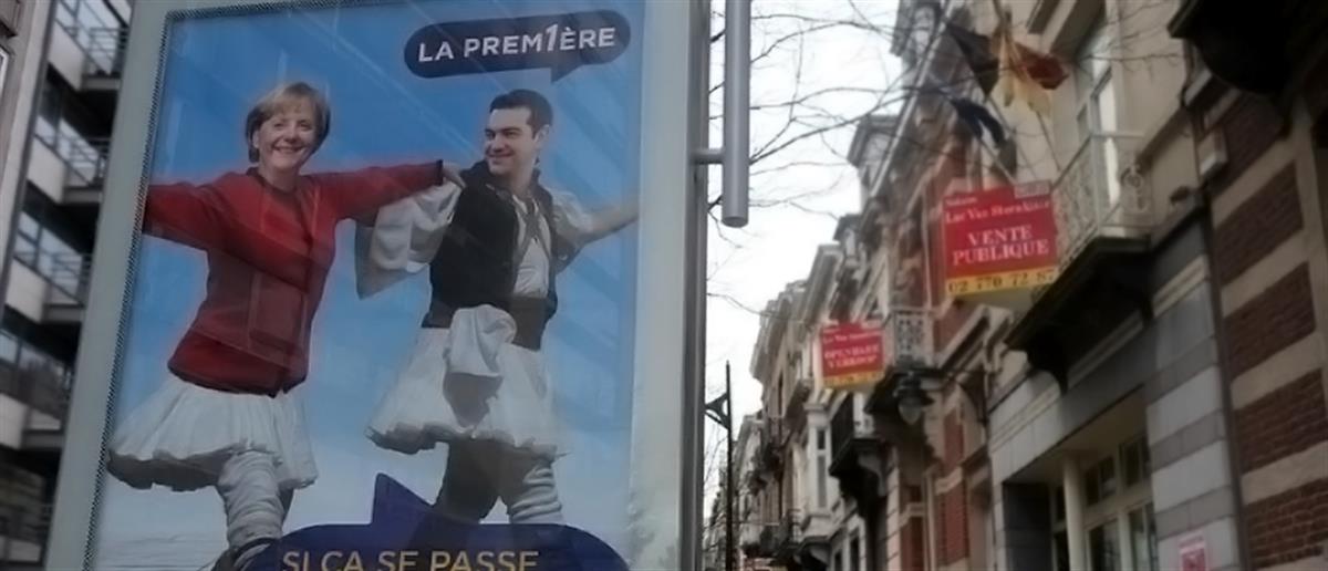 Αφίσες που εμφανίζουν τον Αλέξη Τσίπρα και την Γερμανίδα καγκελάριο, Άγκελα Μέρκελ, ντυμένους τσολιάδες να χορεύουν μαζί συρτάκι, "κοσμούν τις τελευταίες ημέρες τους δρόμους των Βρυξελλών.